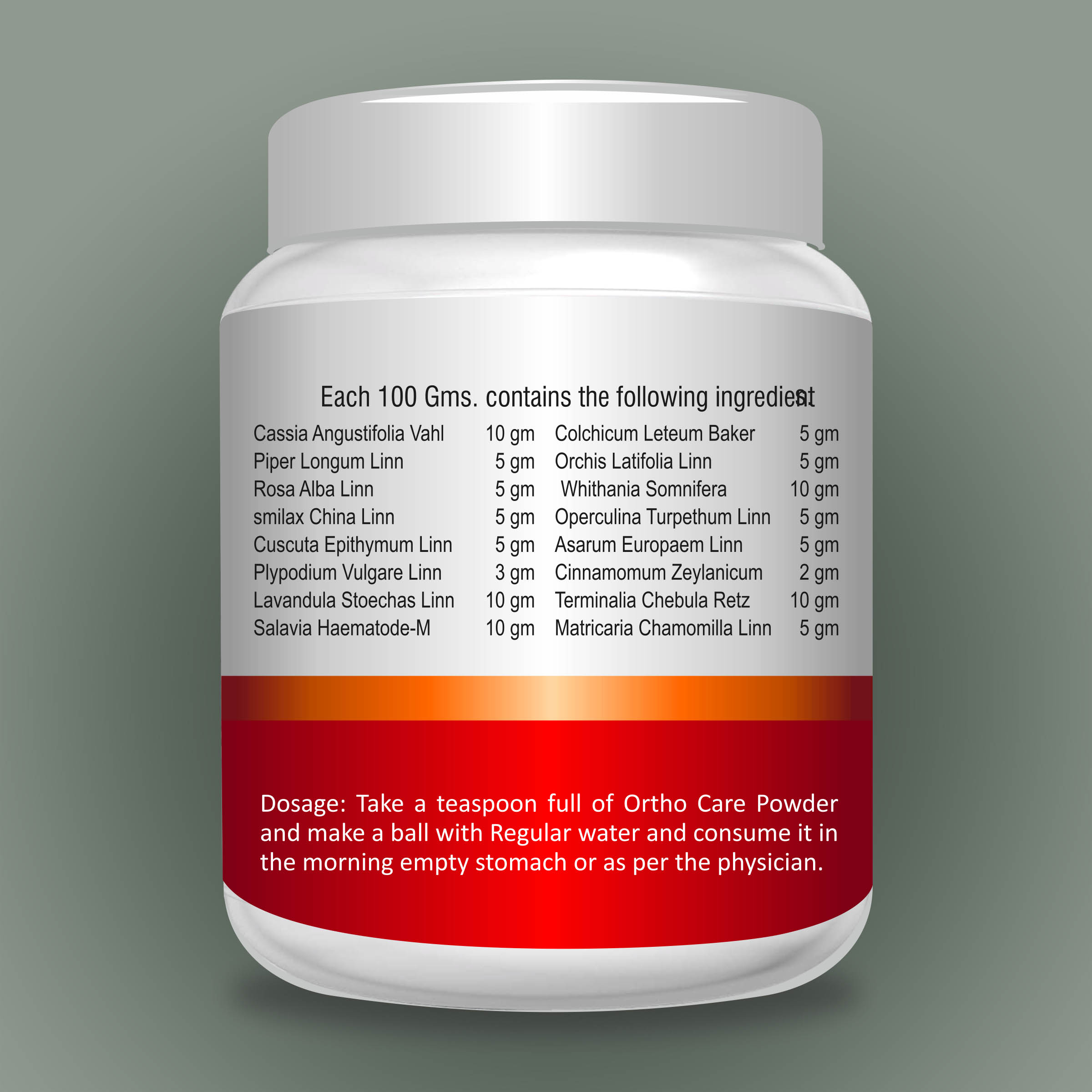 Take 1 teaspoon (approx. 3–5 g) of Ortho Care Powder with warm water or milk twice daily, or as directed by your healthcare professional.