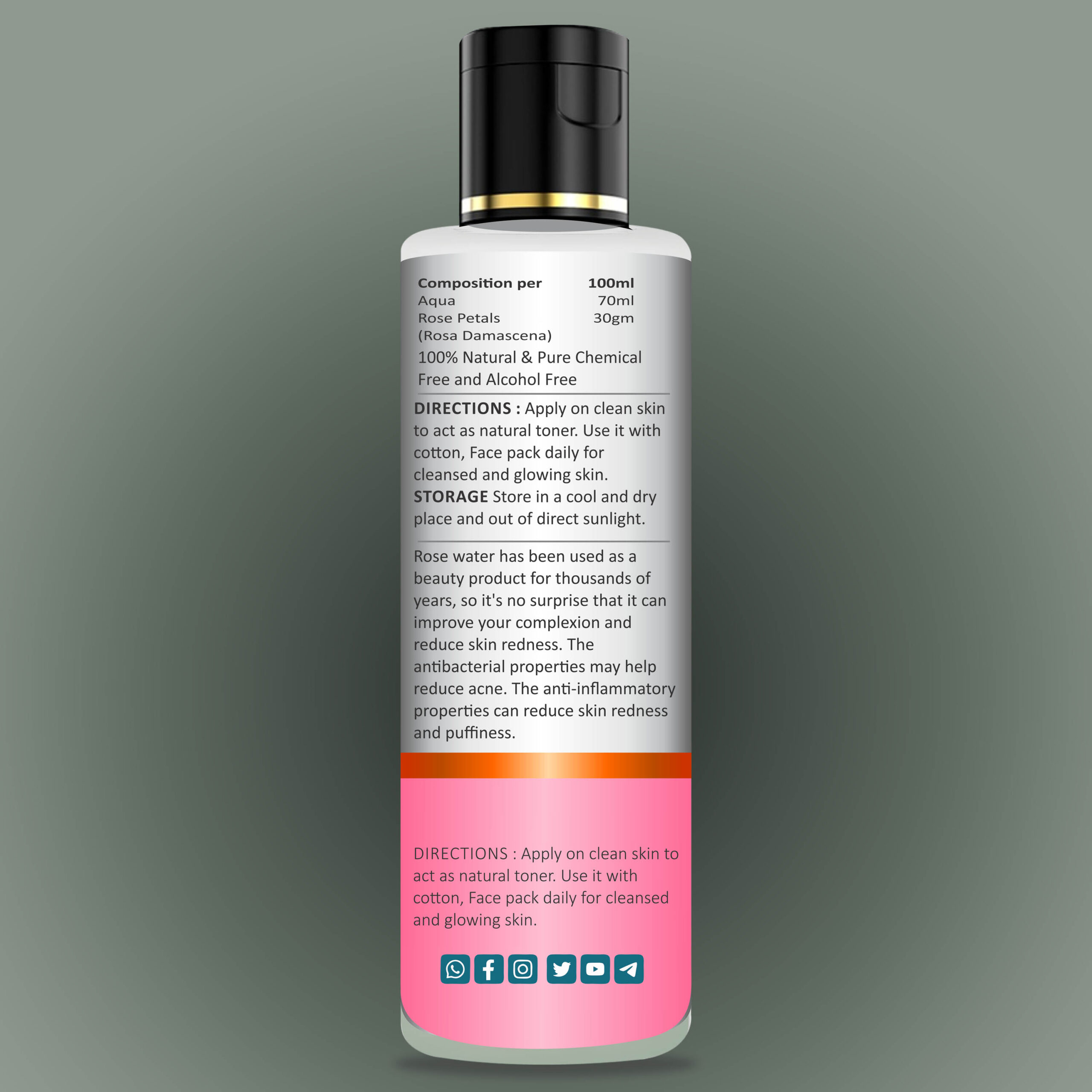 (Gulab Jal) is a 100% pure and natural skin toner made from fresh rose petals through steam distillation.